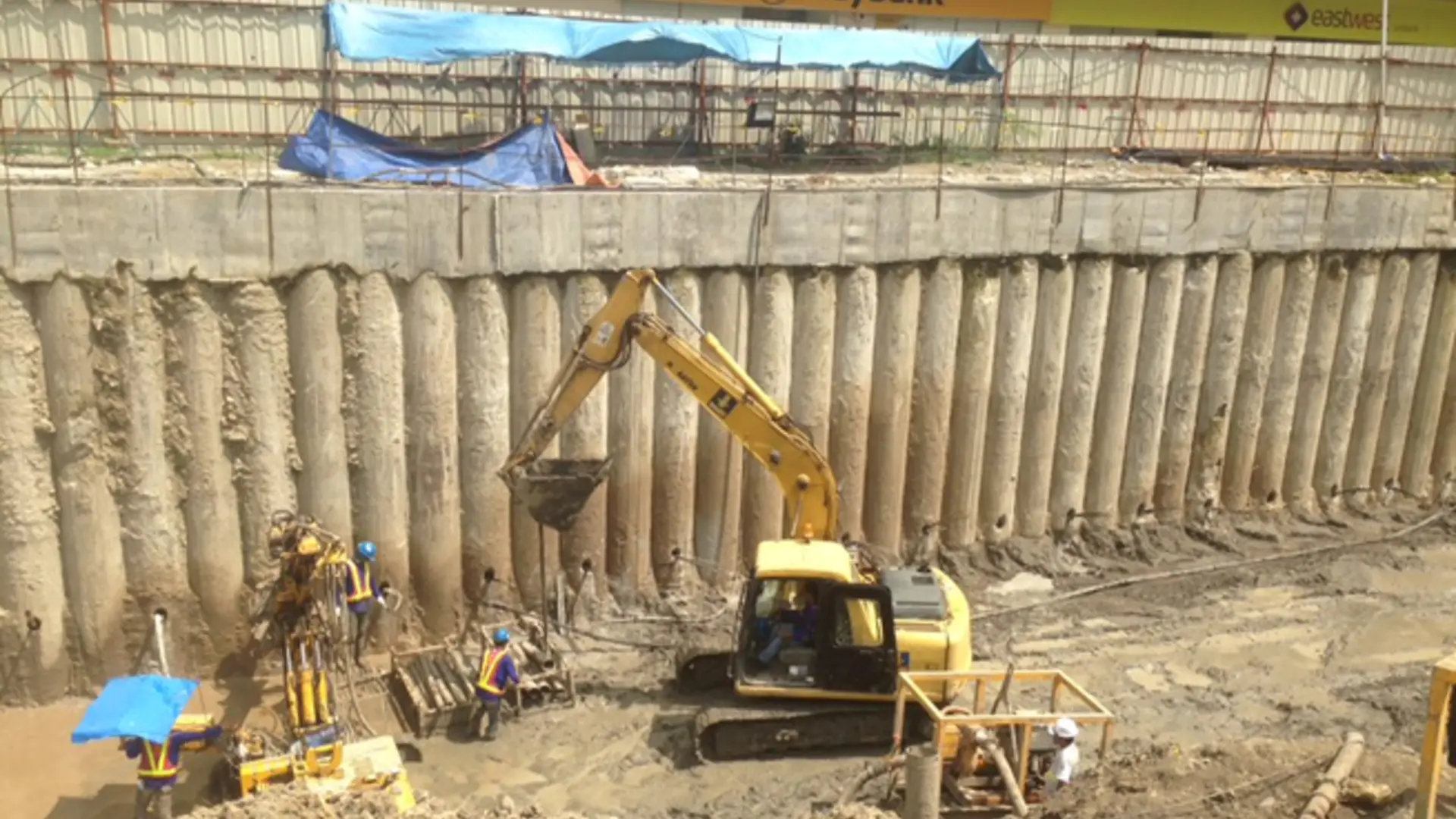 Eastwood Global Plaza is a modern 49-storey luxurious condominium built in accordance with the Leadership in Energy and Environmental Design (LEED) requirements, situated alongside towering buildings. Bauer Philippines carried out the design and construction of shoring works and 280 m capping beam for the 4-storey basement excavation pit. A total of 386 piles with a diameter of 880 mm up to a length of 24 m were installed and the resulting secant pile wall was back anchored with about 836 ground anchors with up to 25 strands each. Double wall casings were used to ensure that pile shaft will have minimal bulking and Drilling Inclination System (DIS) was used for monitoring the verticality of casings. With the performance of BG 40 and BG 30 drilling rigs, our experts completed the project 21 days ahead of its contractual schedule.
